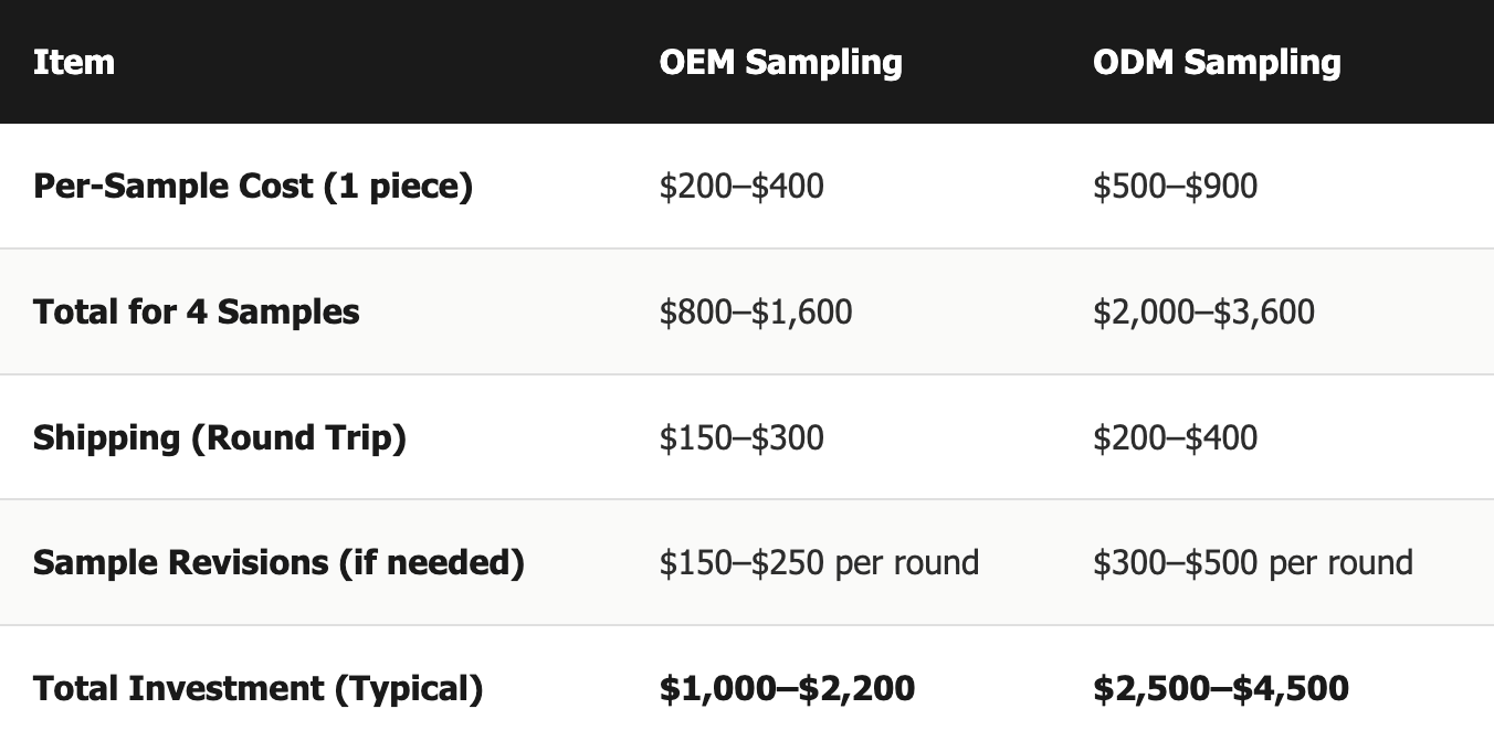 Our recommendation: Start with OEM sampling. You'll get feedback in less than 2 weeks, iterate quickly, and invest significantly less. Once you've locked in your design, shift to ODM for production-ready samples.