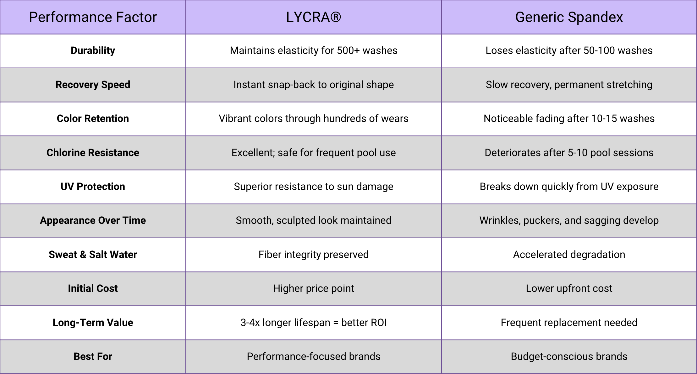 Customer Retention: LYCRA® garments maintain performance through the lifecycle of use. This means fewer returns, better reviews, and higher repeat purchase rates. Generic spandex shows visible wear within a season, driving customer dissatisfaction and social media friction.
